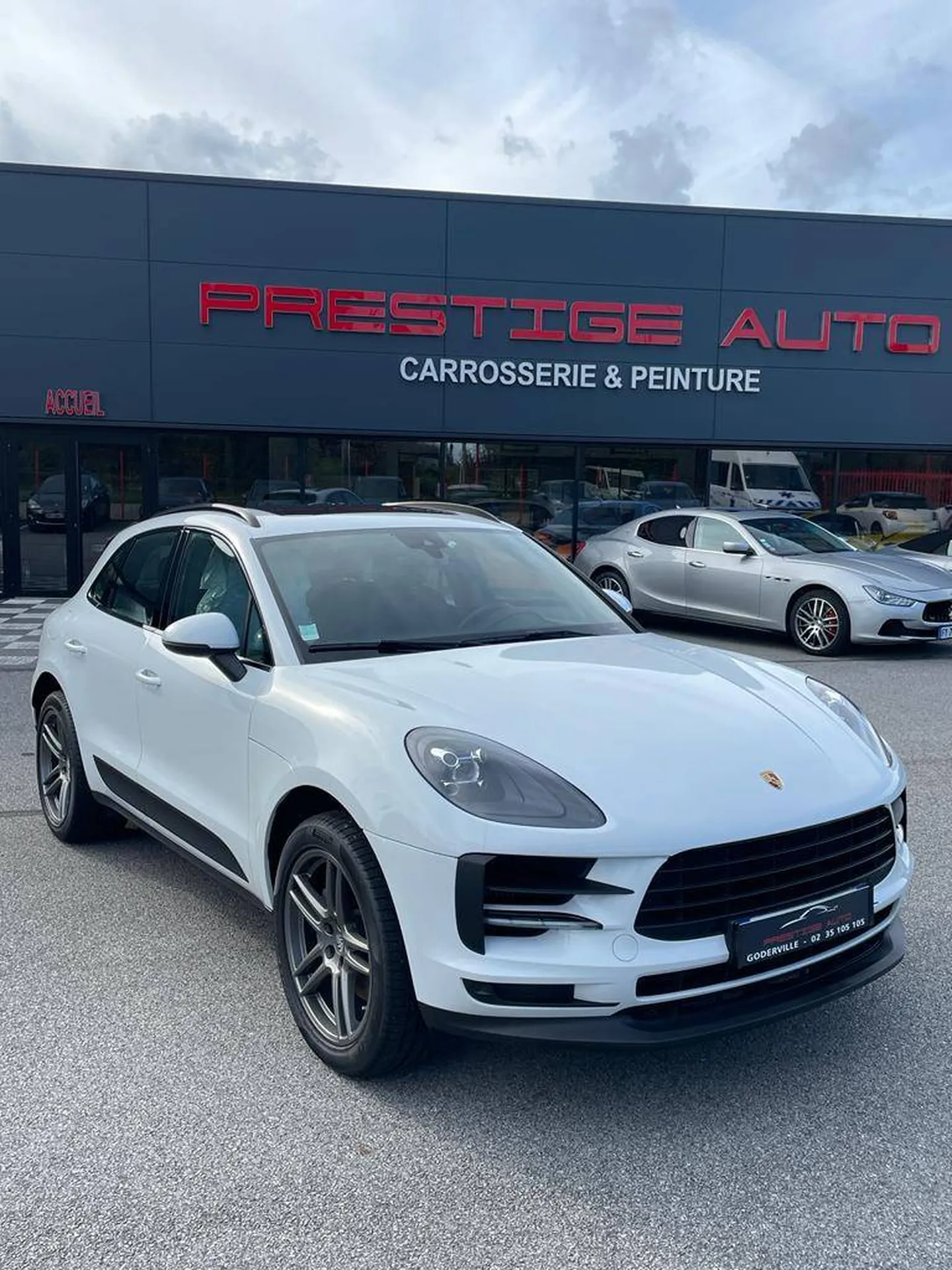 A vendre Porsche Macan blanc dans un garage de voitures de prestige proche de Deauville